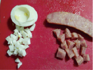 5.ゆで卵の「白身」と、焼き上がったソーセージをそれぞれ小さな角切りにします。