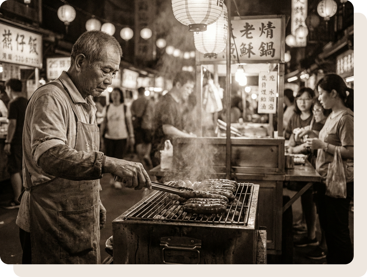 台湾各地の夜市では、この香りに誘われて観光客が列をなすほど。日本でいう「たこ焼き」「イカ焼き」のような、屋台の定番グルメとして世代を超えて愛されています。